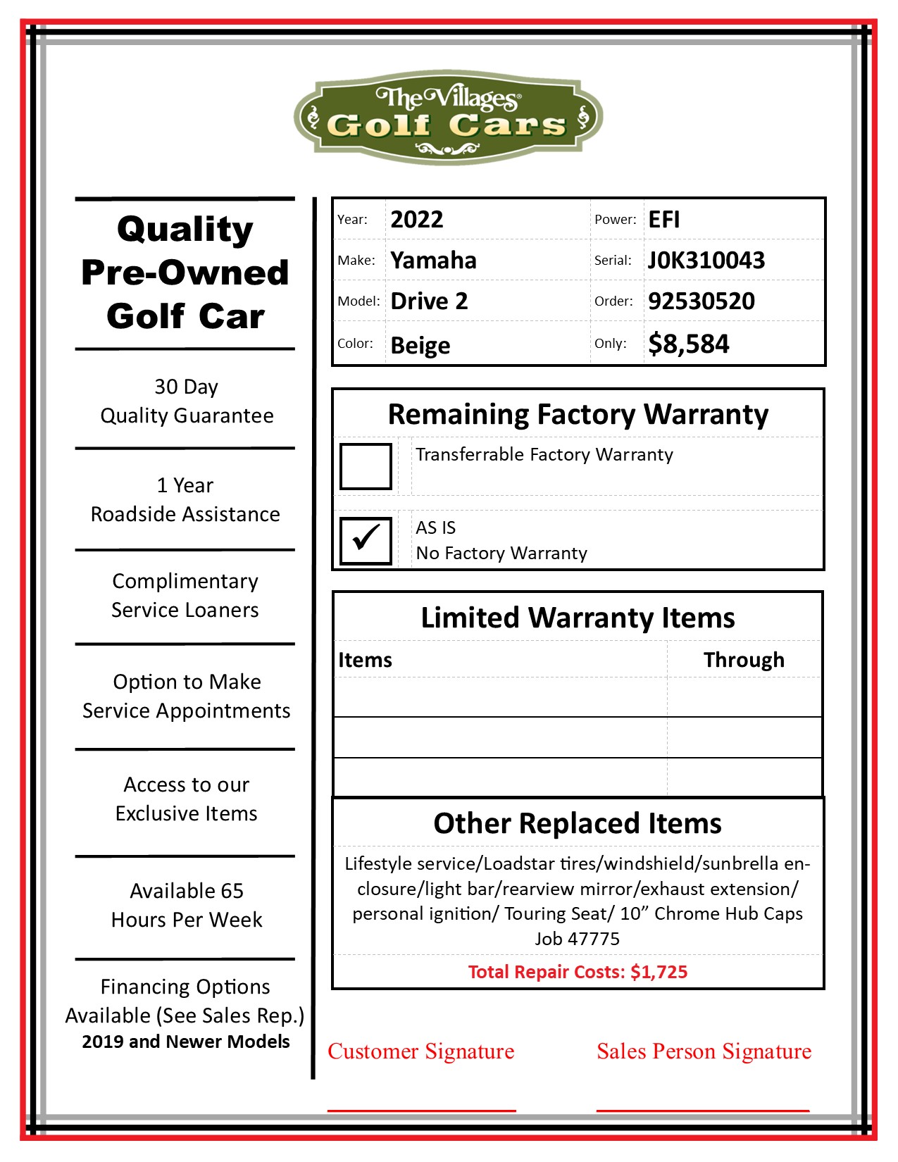 | Additional Accessories | <ul><li>Touring Seat Beige</li></ul> <ul><li>WHEEL COVER 10" VEGAS CHROME</li></ul> <ul></ul> |